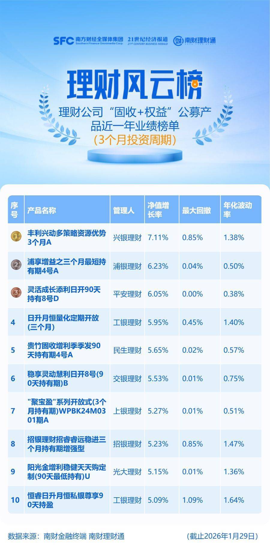 榜单数据说明:统计对象为理财公司发行的3个月投资周期的公募“固收+权益”产品,同系列同投资周期产品保留一只,统计区间为近1年,截止时间为2026年1月29日。理财产品数据来源于南财理财通(https://newgym.sfccn.com/),股票数据来源于Wind。榜单排名由理财通AI全自动化实时排名,如您对数据有疑问,请在文末联系助理进一步核实。