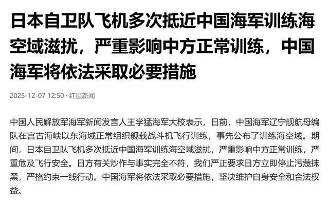 高市本人和其内阁 试图通过主动制造“空中摩擦”的舆论战,让国内民众接受她倡导的“扩大自卫队权限”等政治议程。 这也是为什么,在这次事件中,日方和西方媒体异常急切地使用“照射”、“锁定”、“危险动作”等词汇, 以一种近乎急功近利的方式推动域外媒体形成不专业的单一叙述。 中国海军的反制声明一向简洁明晰,王学猛海军大校所强调的“日方滋扰”“严重影响正常训练”,并非外交辞令,而 是对日机战术行为的准确描述。 根据近年来公开资料,日本P-3C、P-1反潜巡逻机和F-15战机多次以“扇形抵近”“平行伴飞”等方式试图进入中国航母编队的侦察所需距离, 通过拍摄舰载机起降、雷达运转和编组形态来进行全方位侦查。